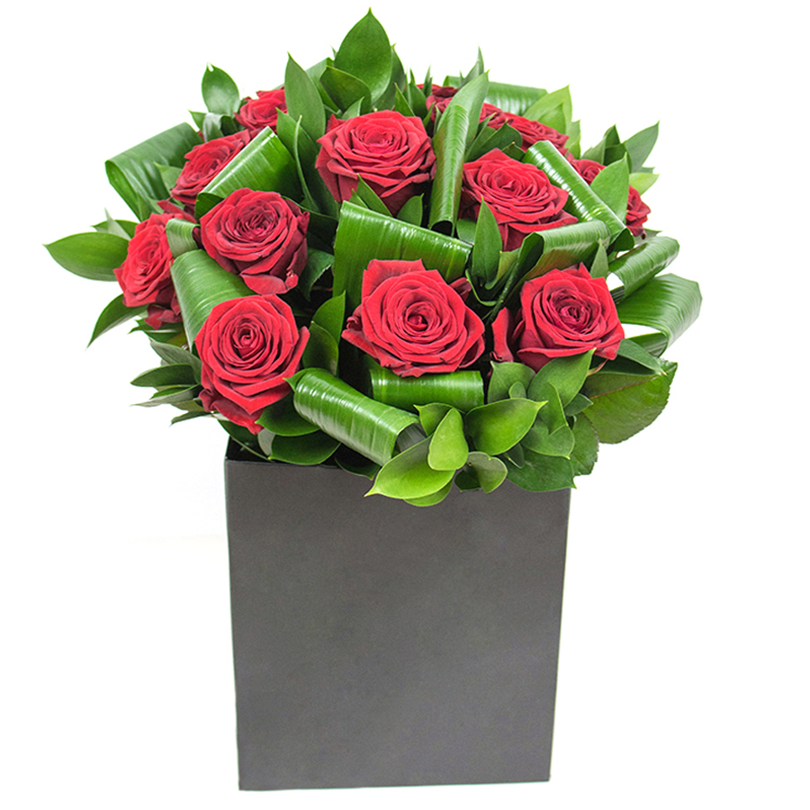Timeless Elegance embodied in our exquisite bouquet of vibrant red roses, lush aspidistra leaves, and graceful ruscus. Each flower is hand-selected to guarantee optimum freshness and quality, ensuring a unique and luxurious arrangement.