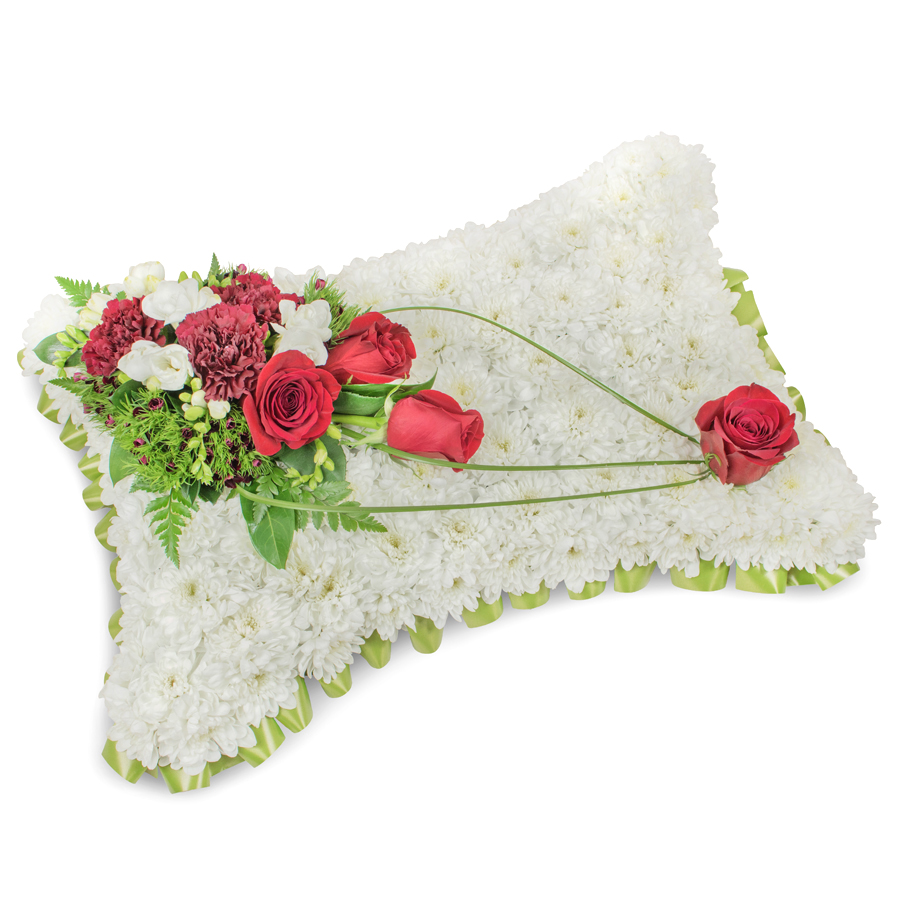 Express your heartfelt condolences with our luxurious sympathy bouquet, featuring a refined mix of white chrysanthemums, red roses, white freesias, and dark red carnations. Accented with dianthus and bear grass, this arrangement embodies elegance and compassion.